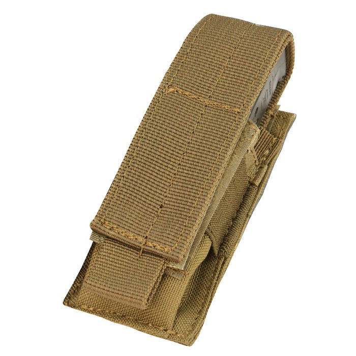 The Condor MA32 Single Pistol Magazine Pouch holds one combat automatic magazine. Sewn elastic panels on sides keep mag snug. The long front flap keeps them secure with a hook and loop closure system. Mounts to MOLLE/PALS webbing. Available in Genuine Scorpion OCP at an additional cost. Imported. Measures 4″H x 2.5″W x 1″D.