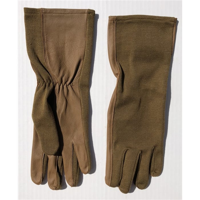 ATTENTION AIRBORNE- NOW AVAILABLE IN COYOTE 498! These lightweight Nomex? Aramid fiber knit gloves provide hand protection in the field and in the cockpit. Gauntlet style for extra forearm protection with fire resistant back panels and soft hair cell sheepskin leather finger and palm areas offer maximum dexterity and control. A must for tactical operations. No Melt- No Drip protection. Gauntlet length gloves provide extra protection in combat and tactical operations where danger of injury from flash and flame could occur. Tested and approved for the U.S. Army ‘s Authorized Combat Glove List. Provides excellent fit and feel for a variety of critical tasks. Authorized Combat Glove List (ACGL) Flame Resistant (Combat Glove) Approved Product. Meet Material Flame resistance requirements per ASTM D 6413. DuPont Nomex? brand aromatic polyamide (Aramid) fiber knitted panels are inherently fire resistant and will not melt or drip. Laundering does not affect fire resistant properties. Perspiration resistant sheepskin glove leather allows excellent dexterity and feel for tool, equipment, and weapon operation. Stays soft and supple even after being wet or laundered. Made in USA!