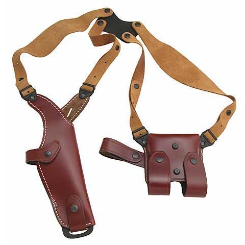 Produced by the fine Italian firm- Vega Holsters, this all leather model is designed to carry the U.S. M9 / Beretta 92F combat auto pistol and other similar auto models ”butt forward” in the vertical position with the muzzle pointed down. This helps to help prevent accidental discharge injuries to persons behind the wearer. Ideal for deployment use and other mission critical situations where underarm barrel rear carry is not allowed. Check your areas of operation (AOR) rules! System comes complete with dual magazine pouch.